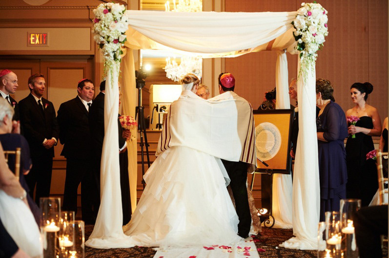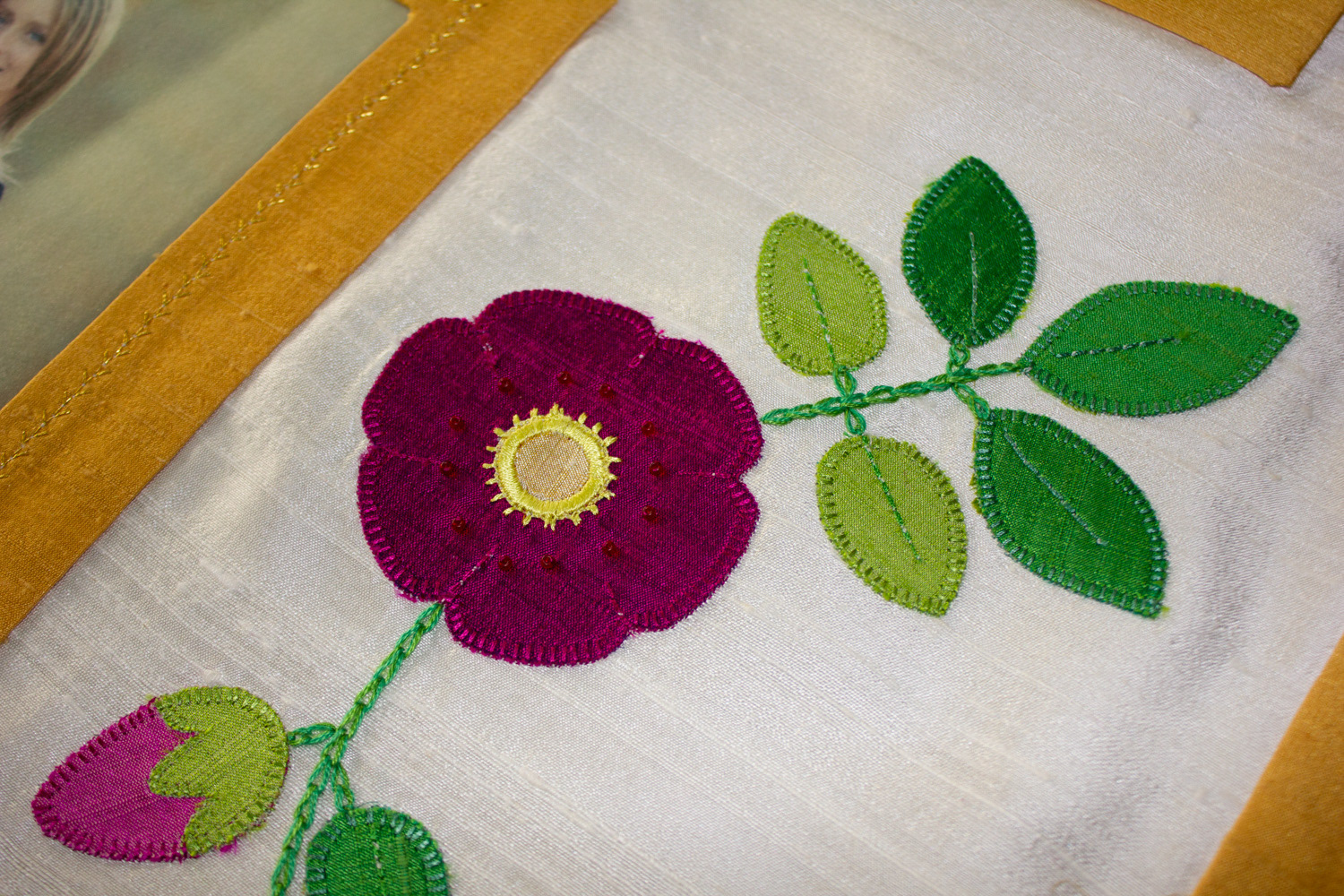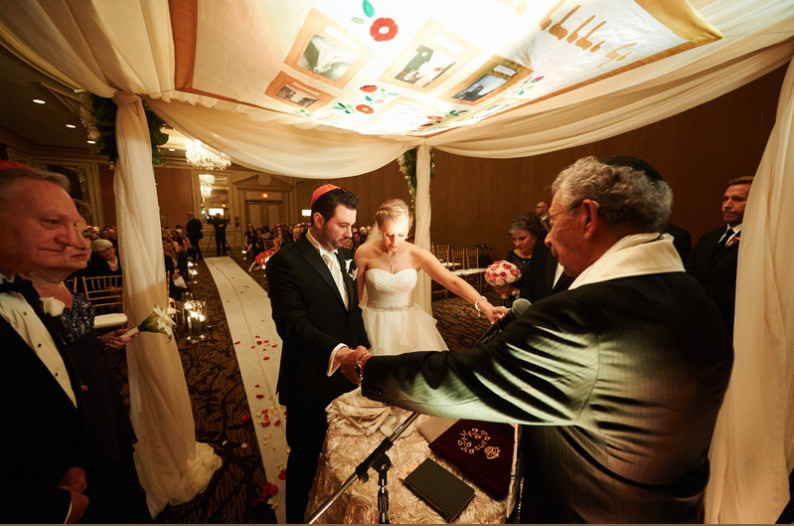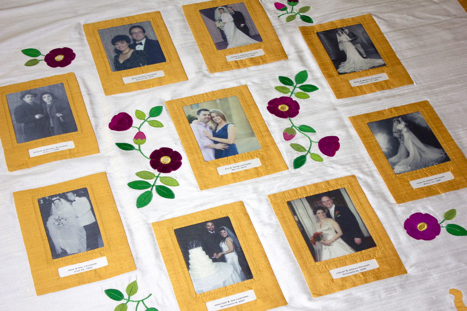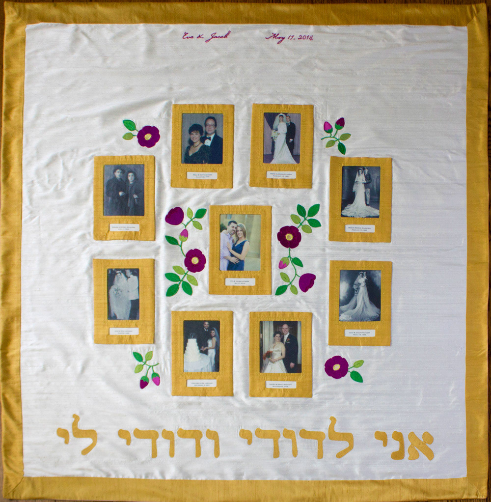 A silk chuppah decorated with family photos that have been printed on silk fabric, along with appliqués in the form of wild roses.
