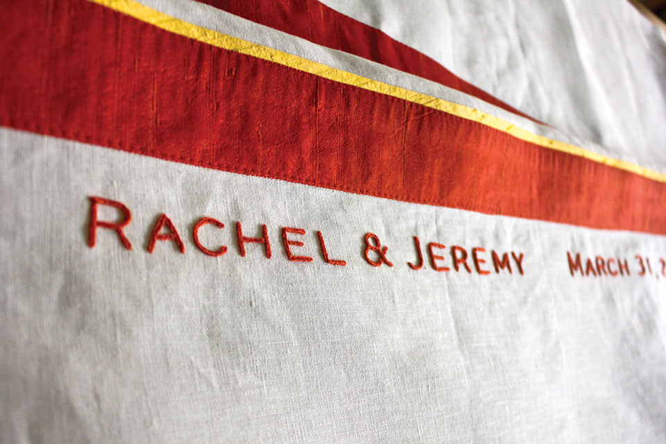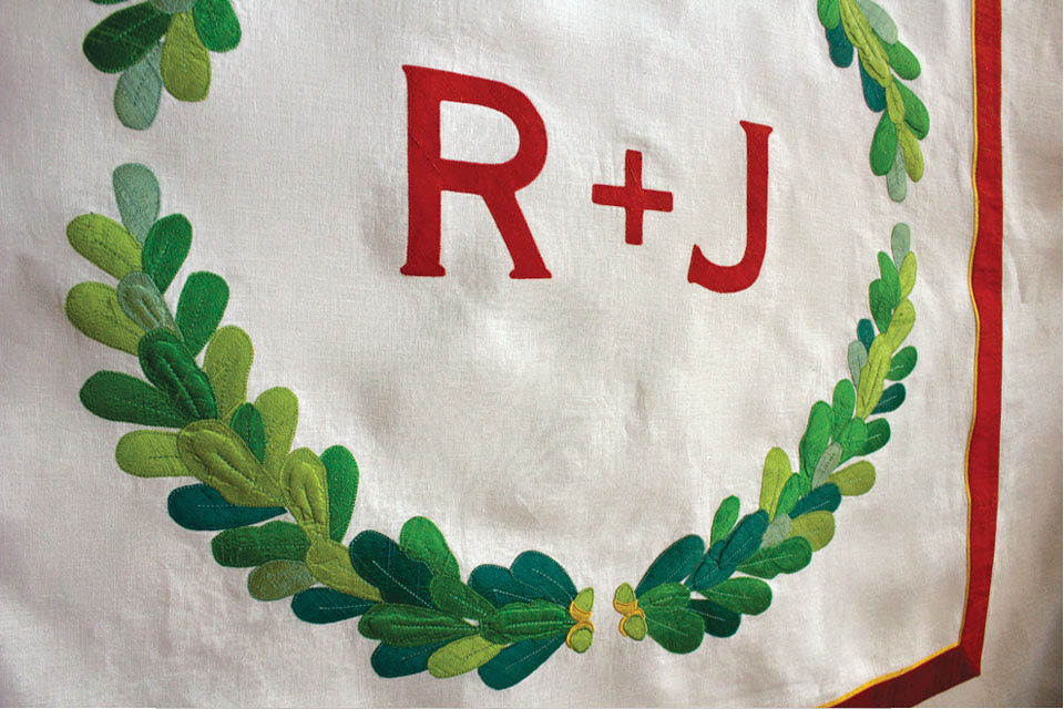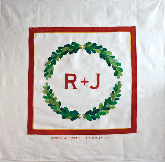 A chuppah with a wreath of appliquéd silk live oak leaves and acorns on a background of crisp white linen.