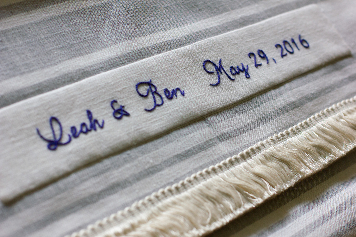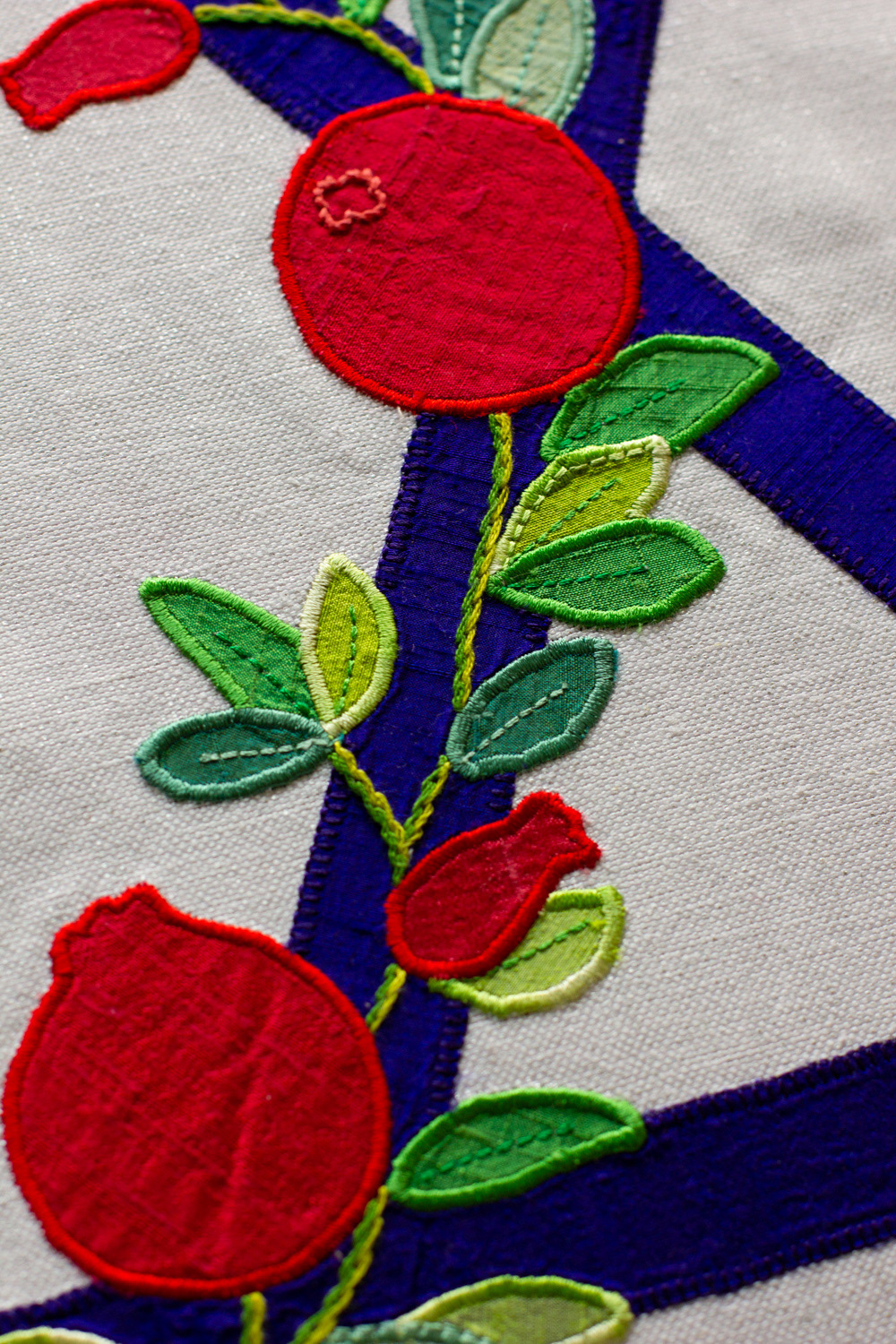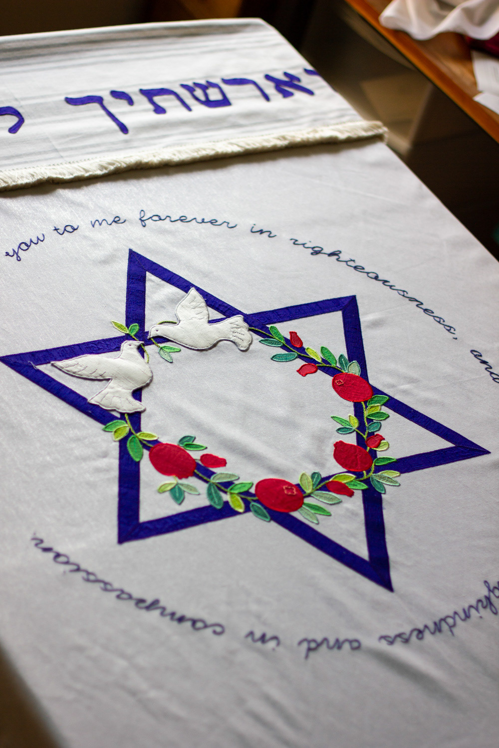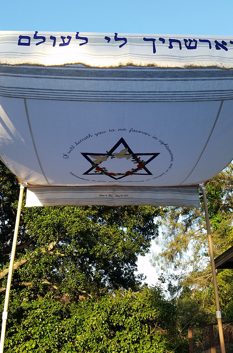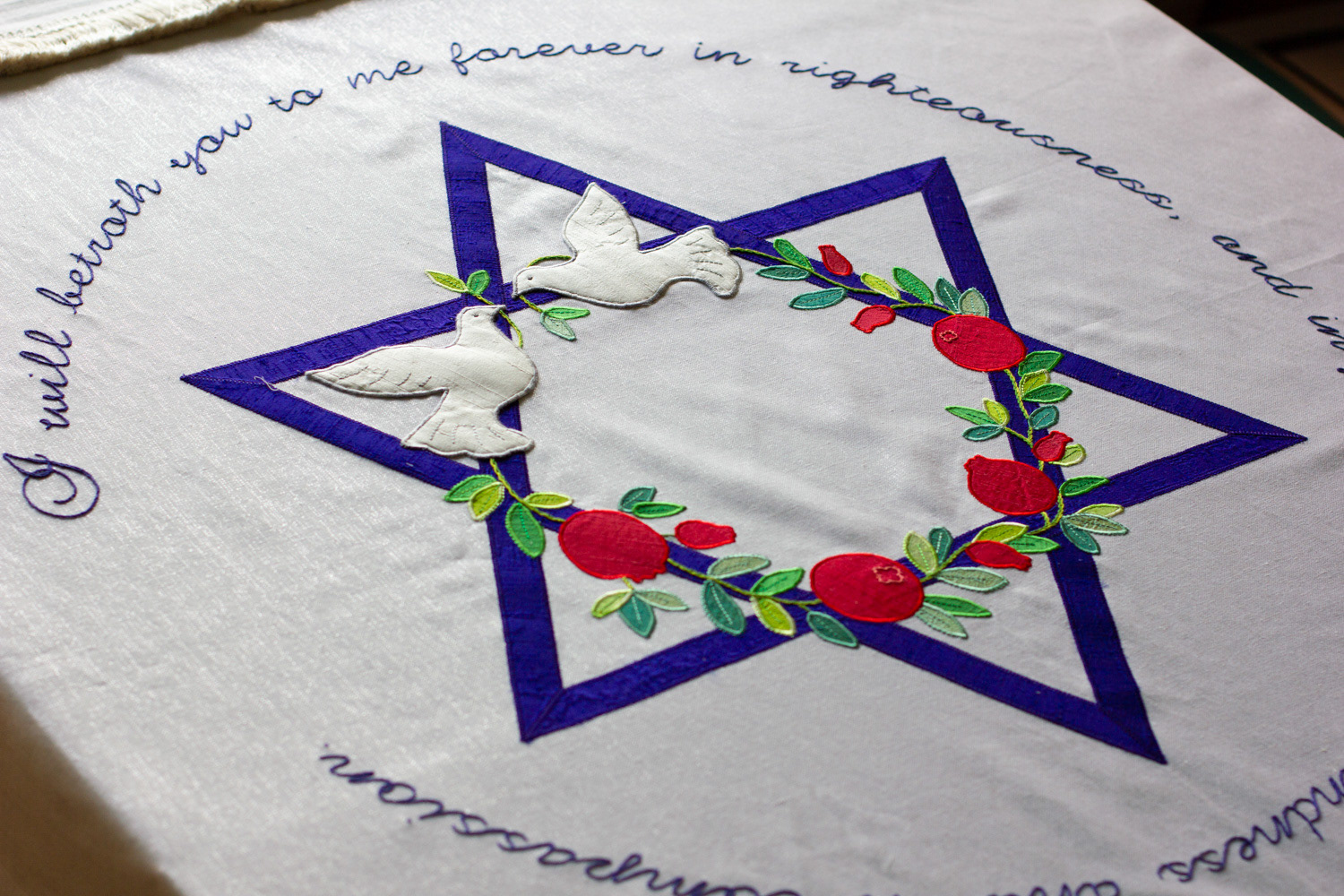 A chuppah with silk appliqués and embroidery on a background of plain and striped linen. Decorations include doves, pomegranates, a star of David and text in English and Hebrew.