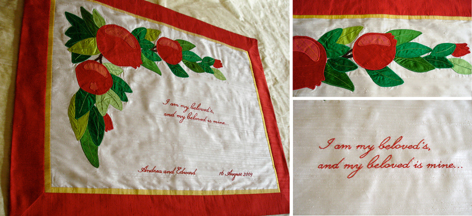 A chuppah in two parts: a decorative panel with pomegranate appliqués and a larger yellow silk canopy. The smaller panel is intended to be detached and displayed in the couple's home after the wedding.